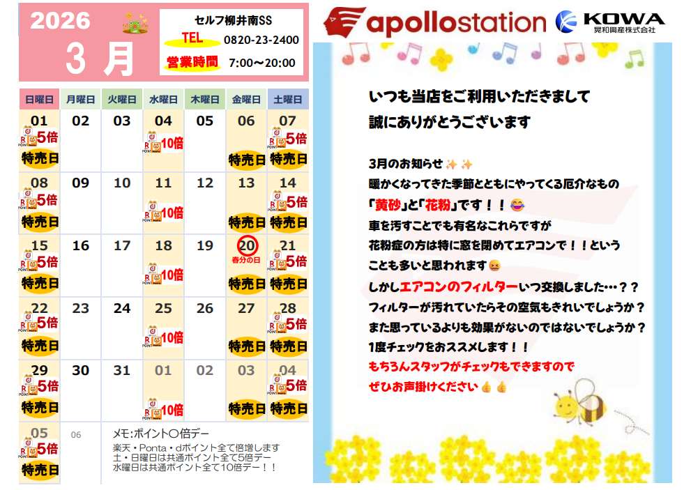 「セルフ柳井南SS」《2026年3月カレンダー》