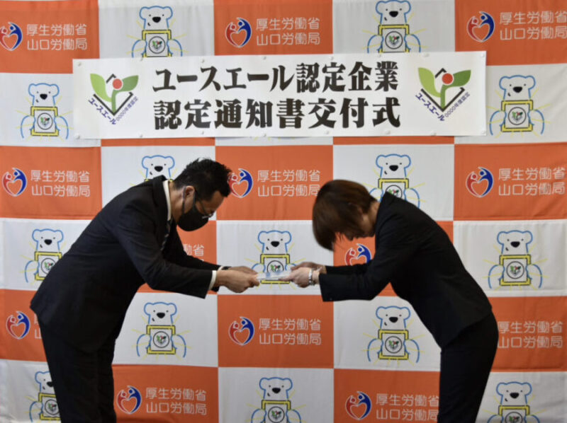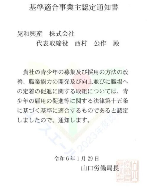 2024年3月7日にハローワーク柳井において厚生労働省「ユースエール認定企業」の「基準適合事業主認定通知書」の交付式がありました。